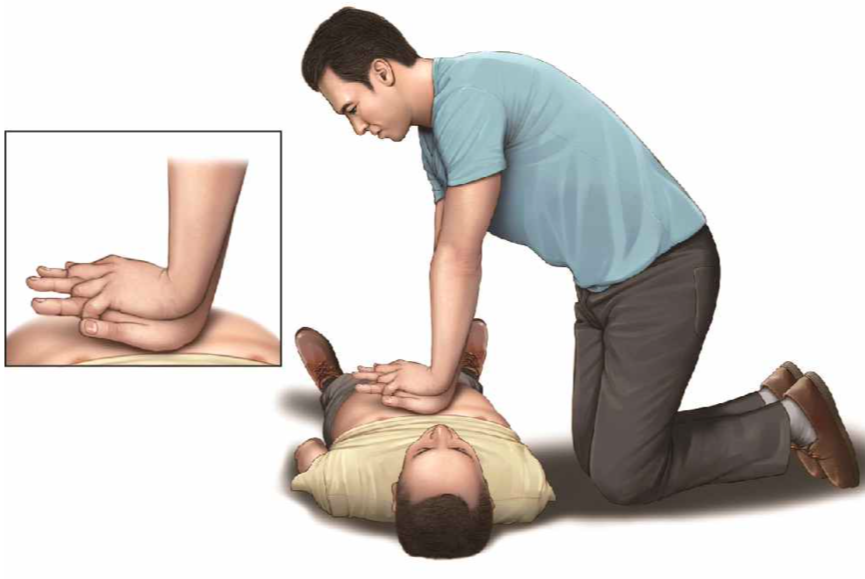 가슴 양쪽 젖꼭지가 연결되는 정중앙 (복장뼈 아래쪽1/2) 한손으로 손바닥을 뒤꿈치를 올려 다른 한손을 깍지를 낀다음 5cm 깊이로 분당 100회~120회 속도로 중단없이 가슴압박 시행해야 합니다. 가슴압박시 양팔을 곧게 쭉 편 상태에서 체중을 실어 환자 몸과 수직이 되어 눌러 주어야 똑같은 강도와 일정하게 압박을 할 수 있습니다.