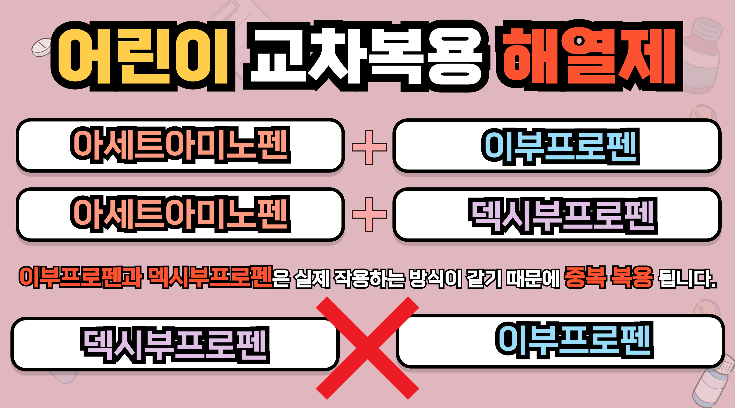 어린이 해열제는 3가지 계열로 아세트아미노펜,이부프로펜,덱시부프로펜 해열제가 있습니다. 영유아의 해열제의 경우 상품명이 아닌 성분명을 정확하게 확인하여 성분마다 명시된 복용 용량과 시간 간격에 맞혀 먹여주시면 됩니다. 아래에는 교차 복용 가능한 해열제와 교차 복용시간을 알아보도록 하겠습니다.