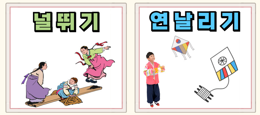 널뛰기 특히 설날과, 추석과 같은 중요한 명절 동안 여성들이 즐겨 왔던 한국의 전통 시소 게임입니다. 참가자들이 앉는 서양식 시소와 달리 널뛰기에서는 긴 나무 판자 반대편에 서서 번갈아 점프하며 서로를 공중으로 띄우는 방식입니다.