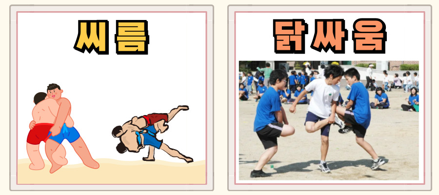 한국의 전통 레슬링인 씨름은 힘과 기술, 전략이 혼합된 게임으로 수세기 동안 즐겨 왔습니다. 우리나라 전통 스포츠의 씨름은 추석이나 단오와 같은 축제와 명절에 참가자들이 자부심, 명예, 가축이나 곡물과 같은 상을 놓고 경쟁하는 경우가 많습니다. 씨름은 독특한 규칙과 문화적 중요성으로 인해 다른 레슬링 형태와 차별화가 있는 우리나라 전통놀이 중 하나입니다.